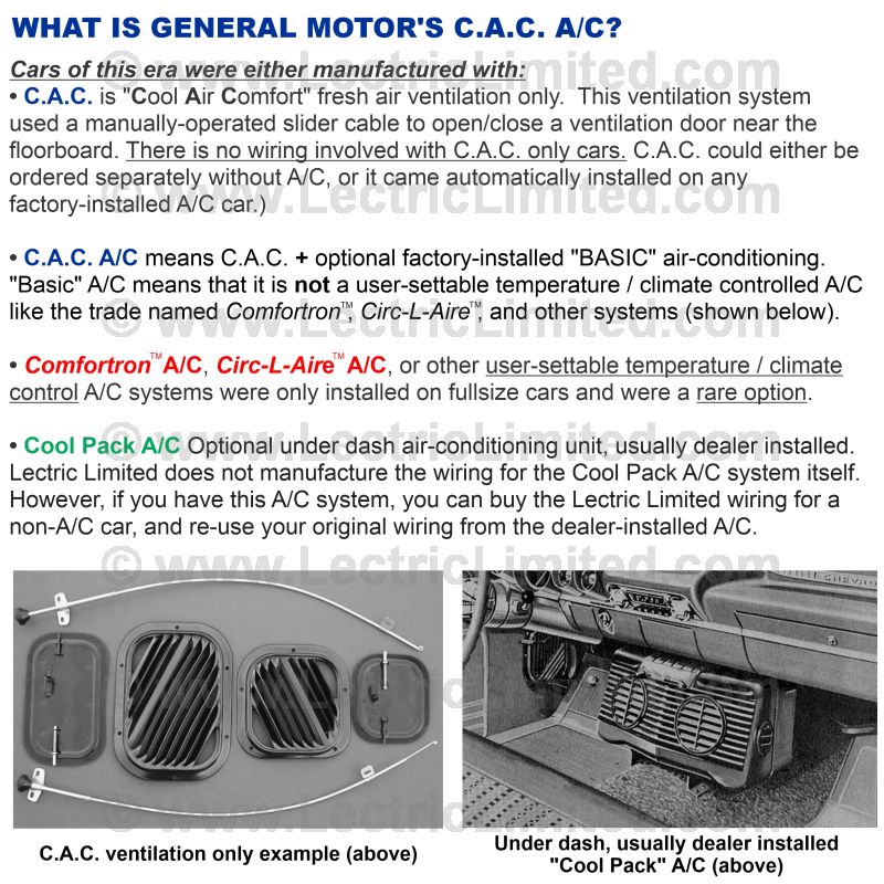 C.A.C. stood for "Cool Air Comfort" fresh air ventilation only. This ventilation system used a manually-operated slider cable to open/close a ventilation door near the floorboard. There is no wiring involved with C.A.C. only cars. C.A.C. could either be ordered separately without air-conditioning, or it came automatically installed on all factory-installed A/C cars of that era.)
