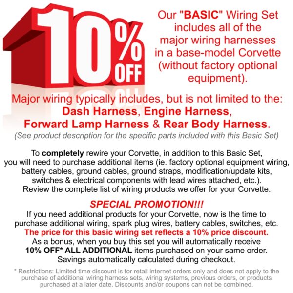 If you plan to completely rewire your vehicle, now is the time to purchase any additional wiring, spark plug wires, battery cables, switches, etc. As described, the price for this harness set reflects a 10% price discount. In addition, when you buy this set you will automatically receive 10% OFF* all additional items purchased on your same order.