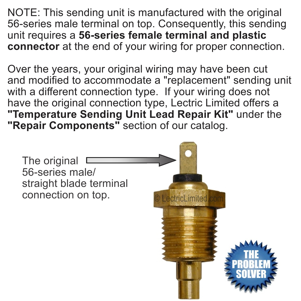 Lectric Limited has devoted months of research into temperature sending units in order to provide our customers with sending units that have the original-type terminal connection, original size housing and original specification inner components, and most importantly the correct thermistor (temperature variable resistor). This attention to detail results in an accurate gauge reading (assuming that your electrical system, grounds, and gauges are working properly, and that your gauges are original, or manufactured to the original specifications).
